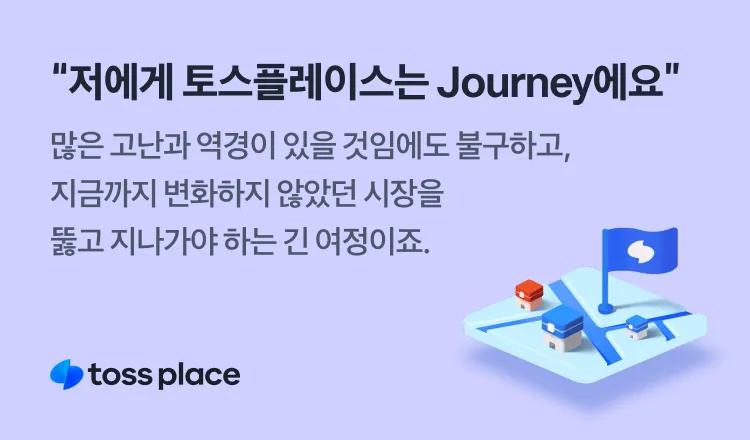 저에게 토스플레이스는 Journey 에요. 많은 고난과 역경이 있을 것임에도 불구하고, 지금까지 변화하지 않았던 시장을 뚫고 지나가야 하는 긴 여정이죠.